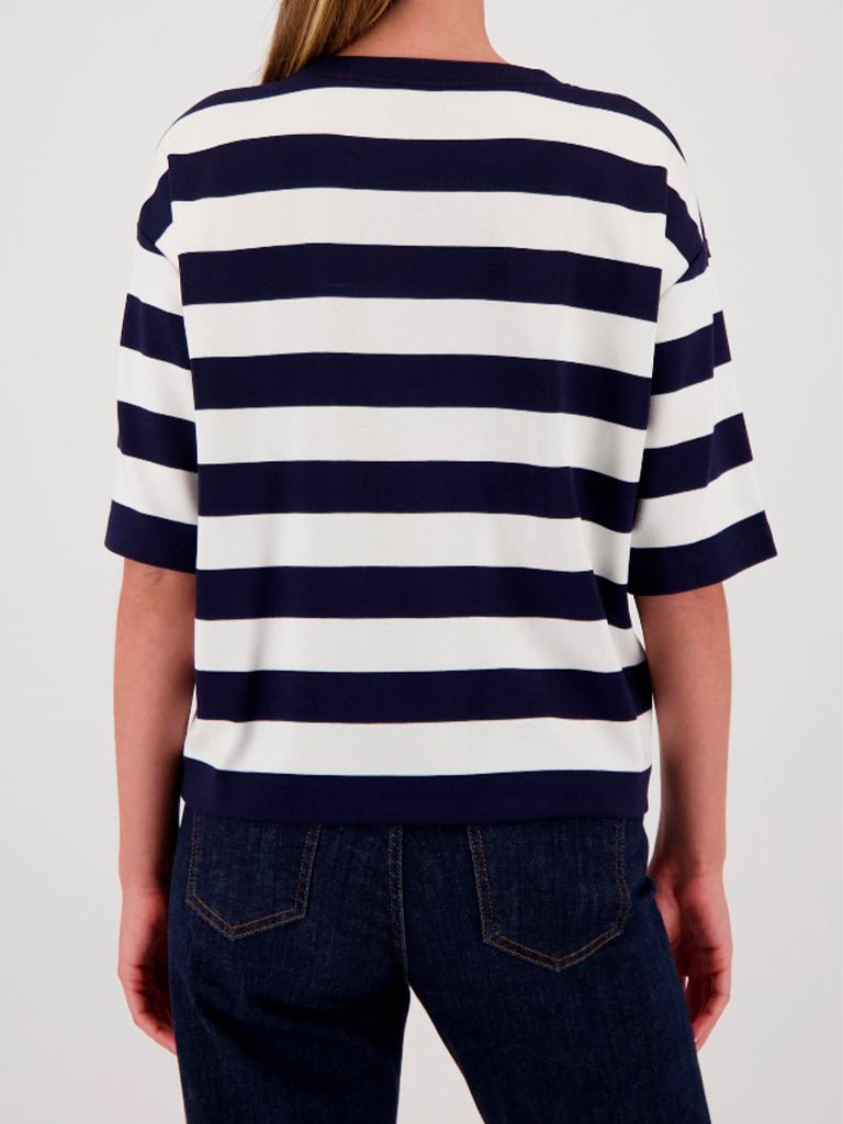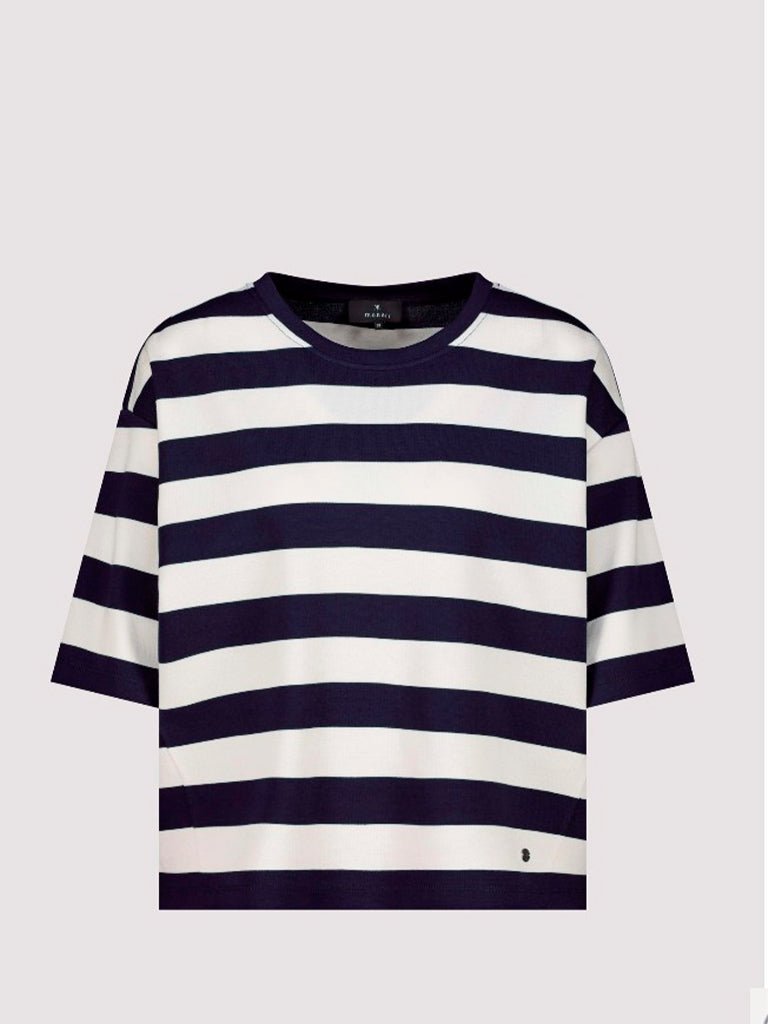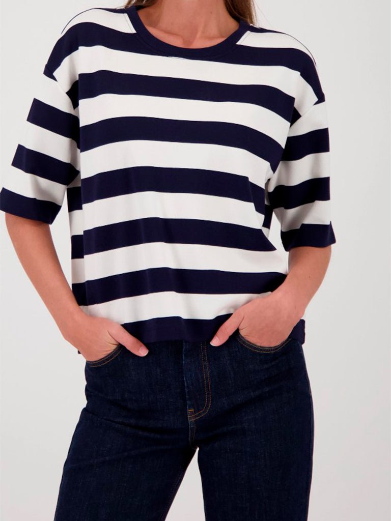 Sudadera oversize con un toque marinero que combina comodidad y estilo. Confeccionada en rayas clásicas con cuello redondo, es la prenda perfecta para un look desenfadado y versátil. Su corte generoso y manga al codo.