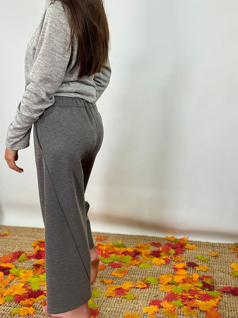 Este pantalón tobillero de pierna ancha ofrece comodidad y estilo con su goma en la cintura y bolsillos laterales. La costura trasera en la pierna realza la figura, brindando un ajuste favorecedor que se adapta a cualquier ocasión. Ideal para un look moderno sin renunciar a la comodidad.