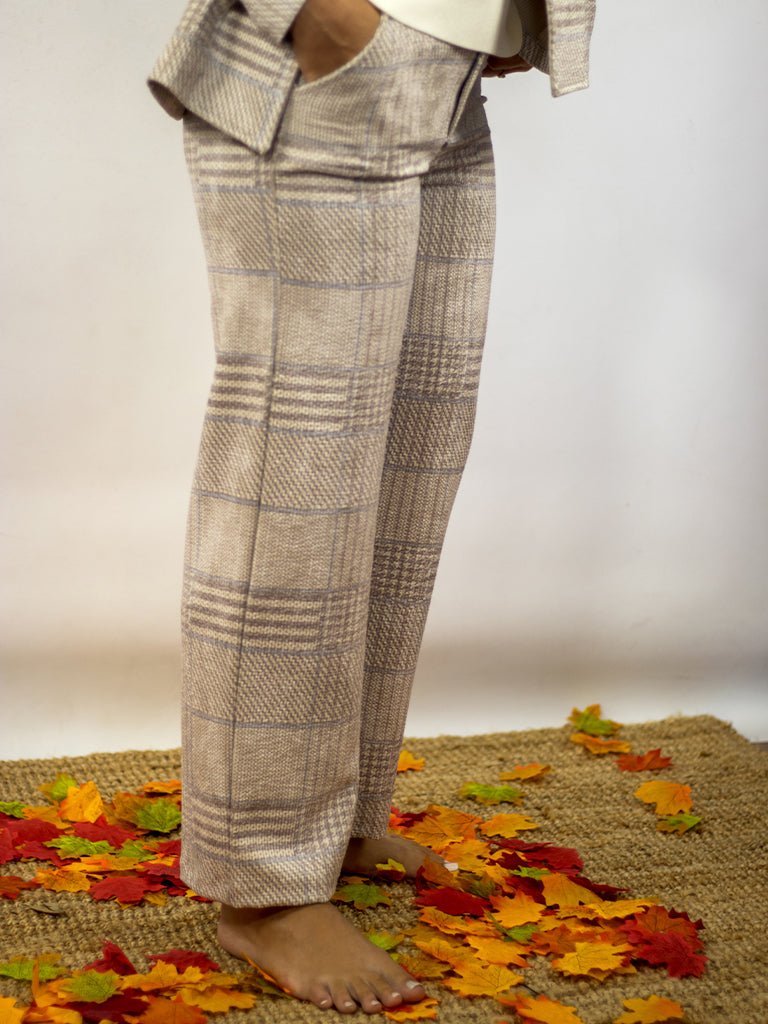 Pantalón con suave estampado de cuadros en pana. Su corte recto realza la figura mientras que la cremallera lateral invisible y la goma trasera aseguran un ajuste perfecto y cómodo. Los prácticos bolsillos laterales añaden funcionalidad sin perder elegancia. Ideal para cualquier ocasión, este pantalón se adapta a tu rutina con un toque sofisticado y actual.