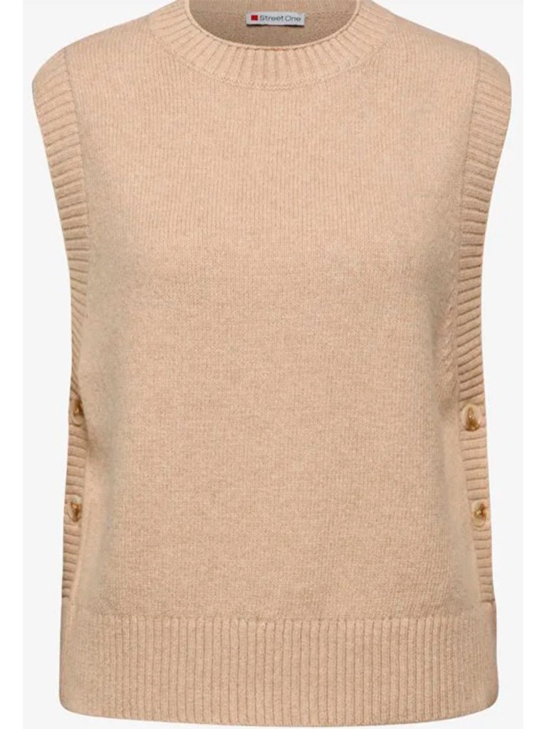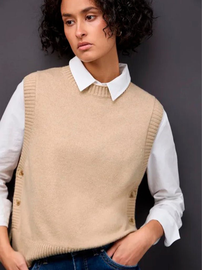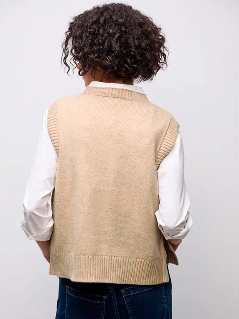 Chaleco de punto con botones laterales que añaden un detalle único que realza su diseño, mientras que la suavidad de su tejido garantiza comodidad durante todo el día. Con un cuello redondo clásico, este suéter sin mangas se convierte en un básico versátil.