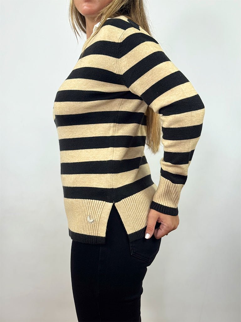 El jersey Bibi Rayas combina un diseño clásico con detalles modernos, gracias a su cuello redondo y cortes laterales que aportan comodidad y estilo. Perfecto para renovar tu armario con una prenda versátil.