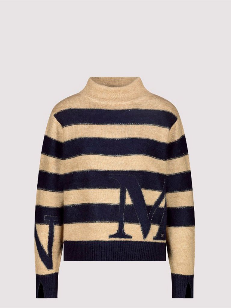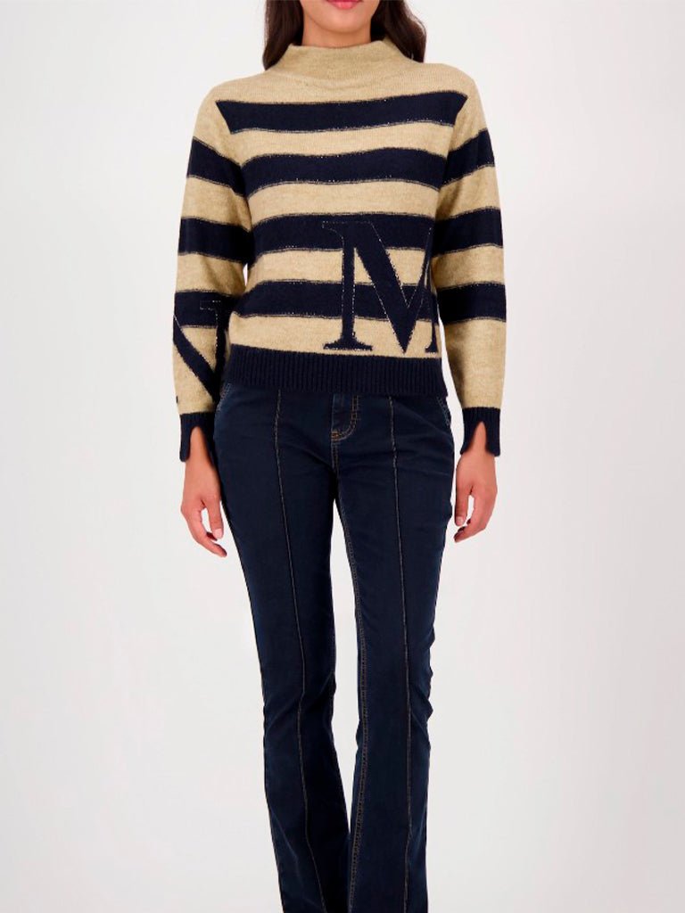 Jersey que combina la suavidad de la viscosa fluida con un sofisticado estampado a rayas y detalles de pedrería que realzan su diseño. Cuello chimenea y puños con abertura.