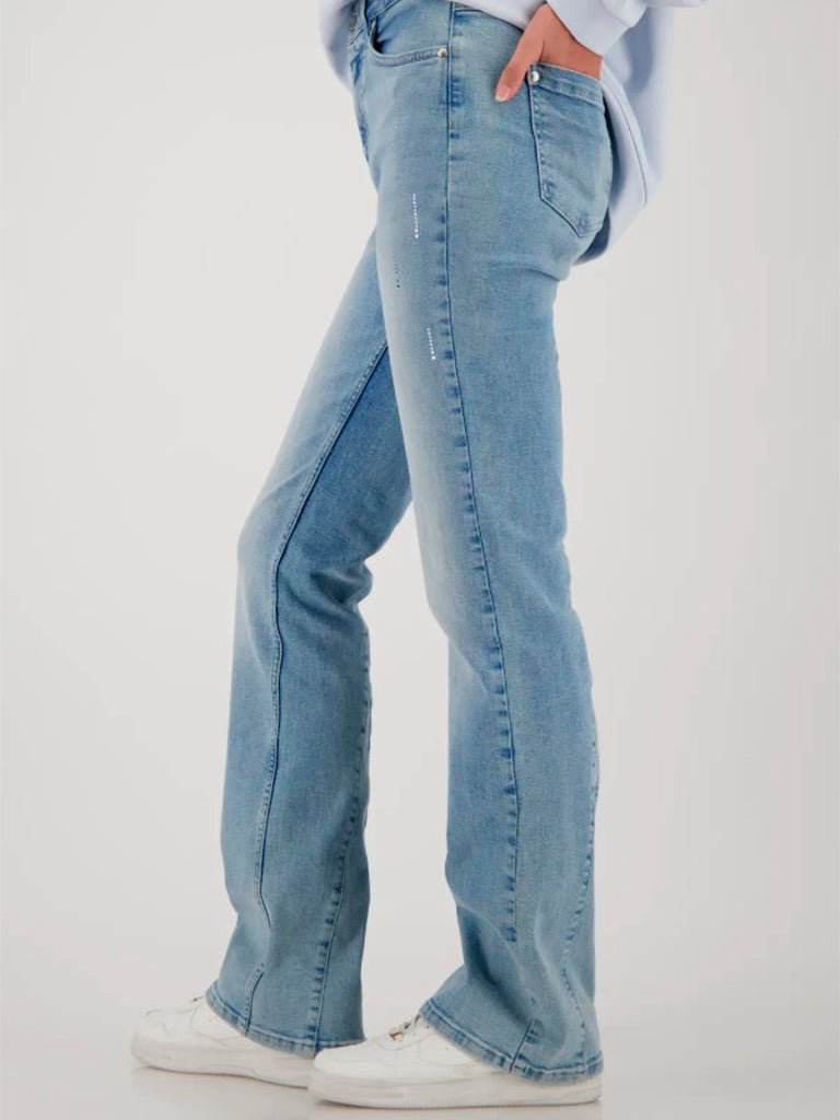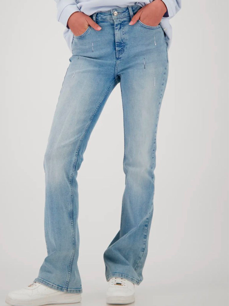 Tejano tipo boot cut en tono claro y detalles de pedrería. Confeccionado en algodón de alta calidad.