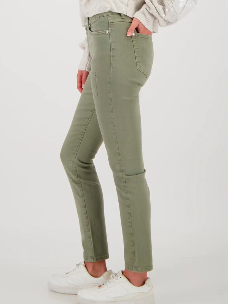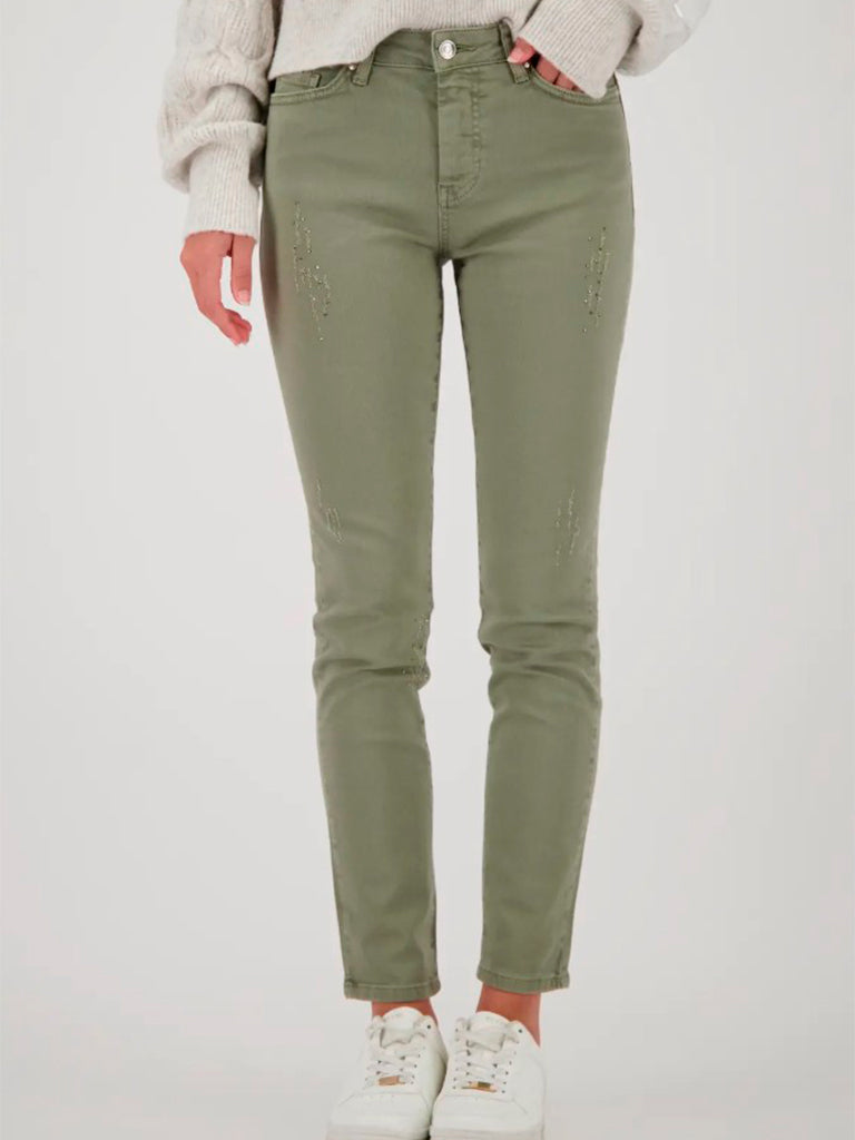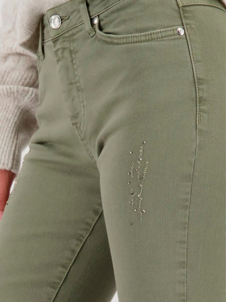 Tejano confeccionado en denim desgastado con ese tono sage que marca tendencia, este tejano de 5 bolsillos combina estilo vintage con comodidad moderna. Su talle ajustado realza la figura, mientras que los detalles de pedrerita añaden un toque sofisticado y diferenciador.