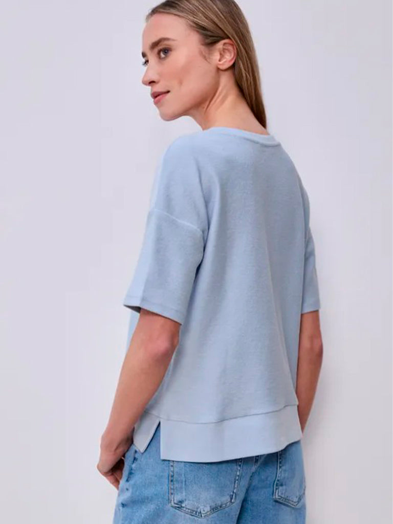 Camiseta tipo sudadera con cuello redondo y manga a codo. Presenta aberturas laterales y bolsillo decorativo en el delantero. Suave, cómoda y perfecta para looks casuales con un toque actual.