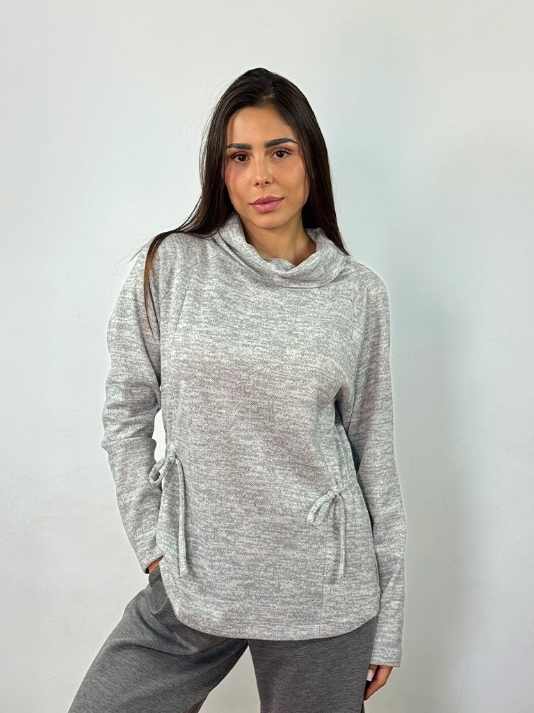 Jersey fino de tejido vigoré. Cuello desbocado con frunces  en la cintura, ajustables mediante cordón para un fit personalizado.