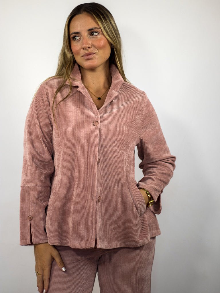 La americana Blueberry destaca por su tejido de pana suave y su corte tipo evasé que realza la figura con elegancia. Sus bolsillos laterales añaden funcionalidad sin perder estilo, mientras que el detalle de corte en las mangas aporta un toque distintivo y moderno.