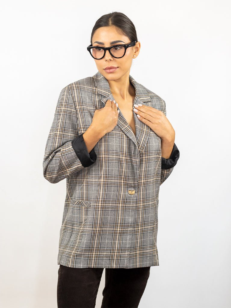 Americana cuadro de gales, combina elegancia y estilo con su diseño de solapa smoking, botón único y prácticos bolsillos delanteros. Su forro negro aporta un acabado sofisticado y cómodo, ideal para destacar en cualquier ocasión.