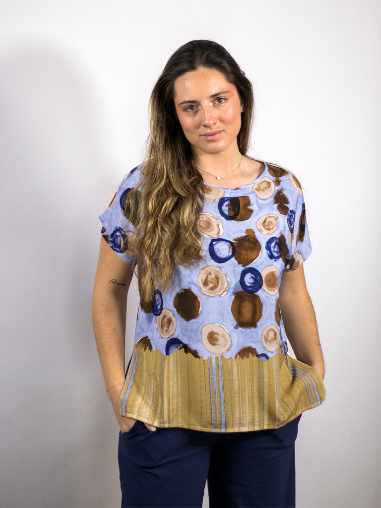 Blusa cuello barca, manga caída estampada. Cortes laterales.