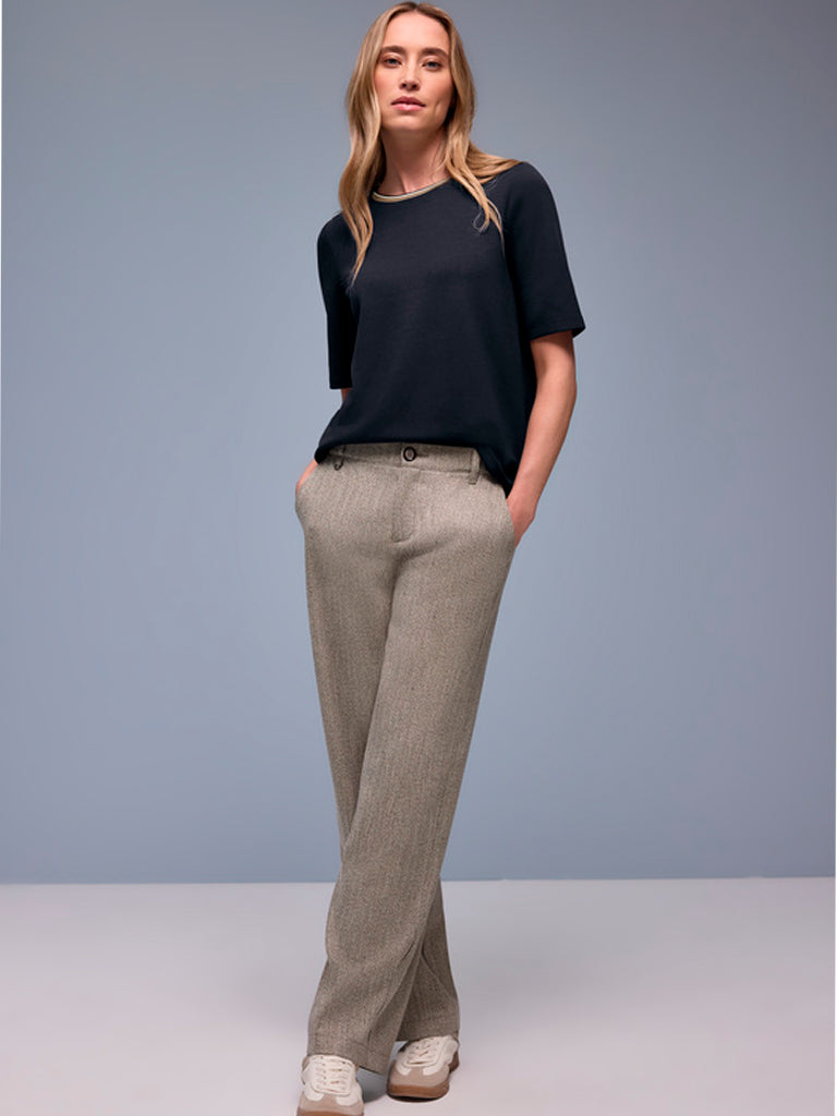 Camiseta en manga corta y cuello redondo, con detalle de contraste. La mezcla suave de viscosa con contenido elástico garantiza un ajuste cómodo.