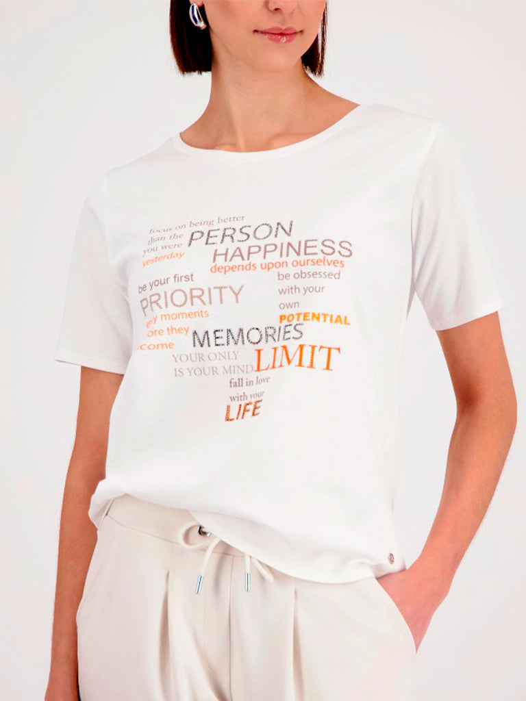 Camiseta de manga corta con cuello redondo. Diseño frontal con letras mensaje en tonos naranjas y marrones, realzadas con brillos.