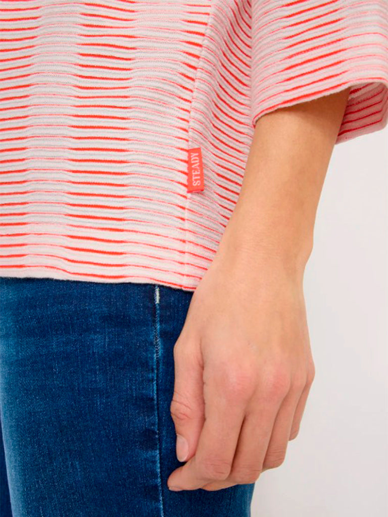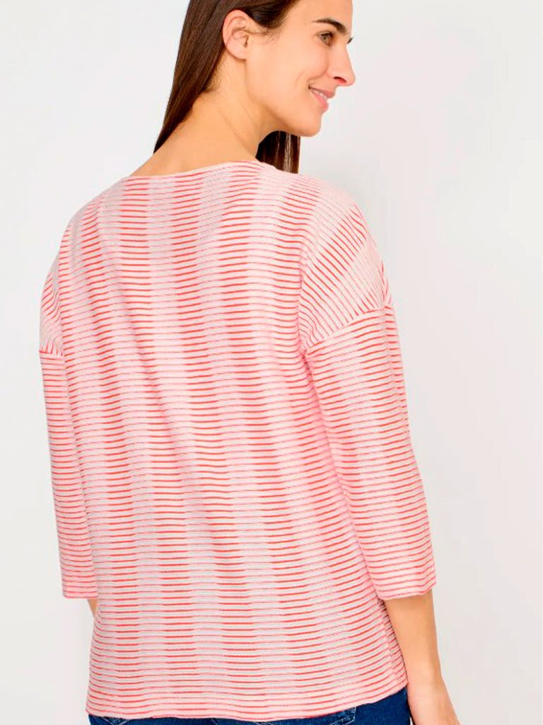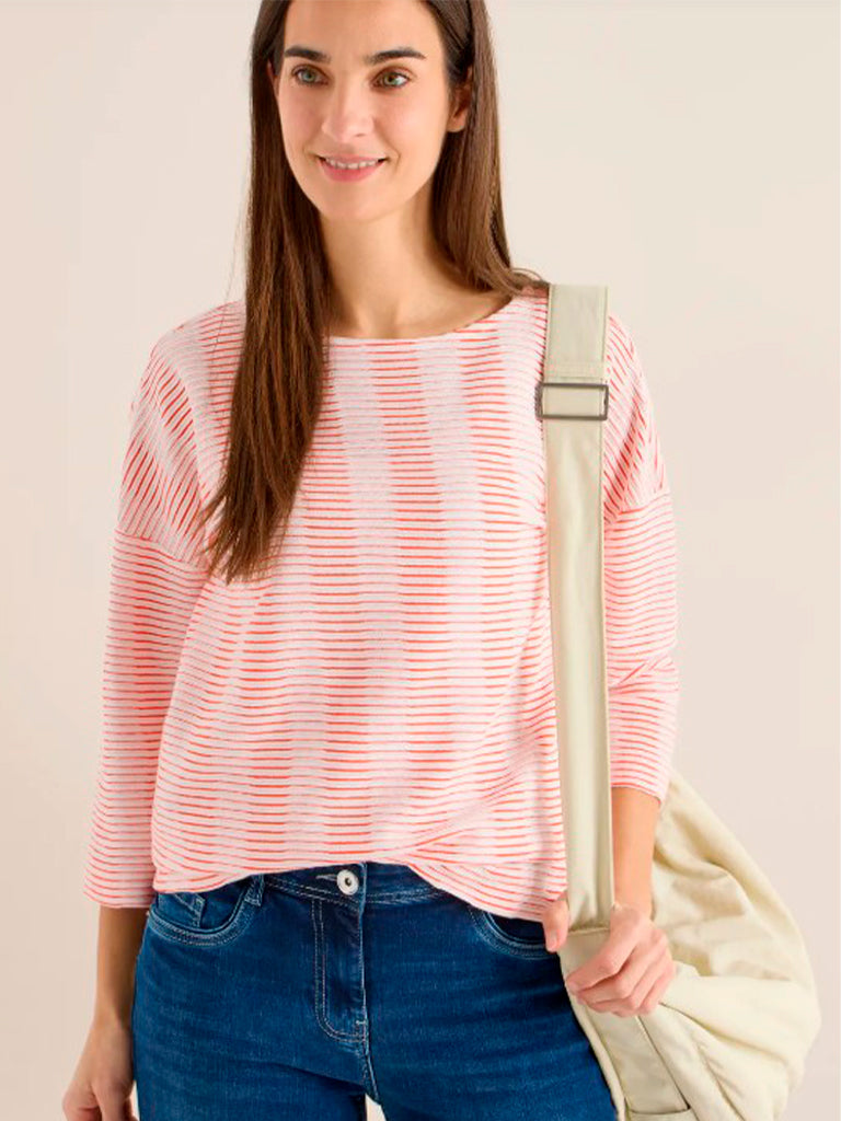 Camiseta cuello barca, manga 3/4 y manga caída, fusiona rayas dinámicas con una textura ondulada única. Confeccionada en una delicada mezcla de algodón y modal, proporciona una suavidad excepcional que acaricia tu piel durante todo el día.