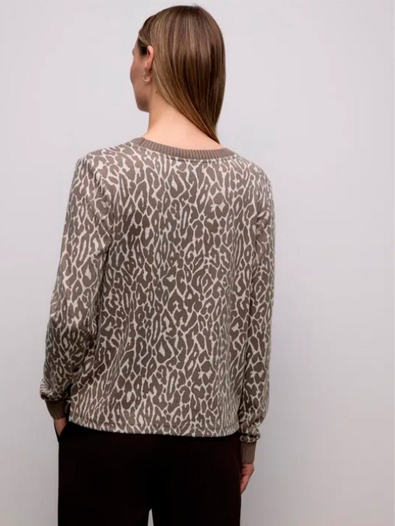 Camiseta cuello redondo con jaquard de leopardo. Los detalles acanalados en el escote y los puños subrayan el aspecto deportivo, mientras que la mezcla de material con elasticidad promete una comodidad agradable al llevar.  Composición: 64% Poliéster/ 33% Viscosa/ 3% Elastan.