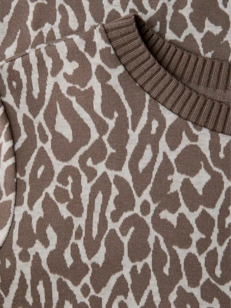 Camiseta cuello redondo con jaquard de leopardo. Los detalles acanalados en el escote y los puños subrayan el aspecto deportivo, mientras que la mezcla de material con elasticidad promete una comodidad agradable al llevar.