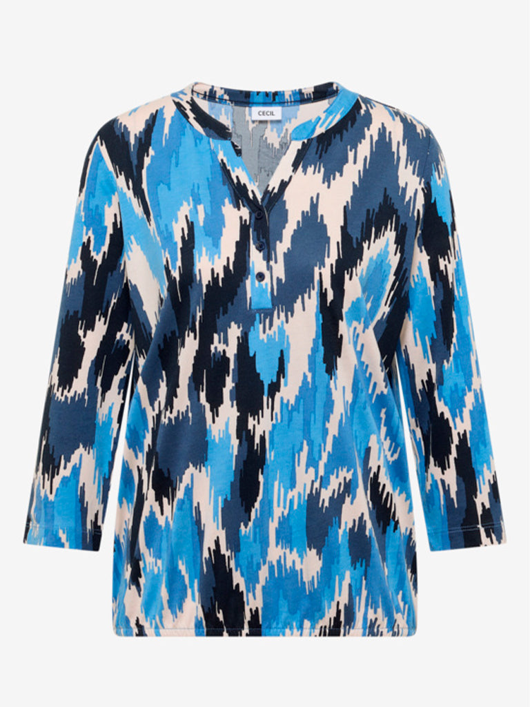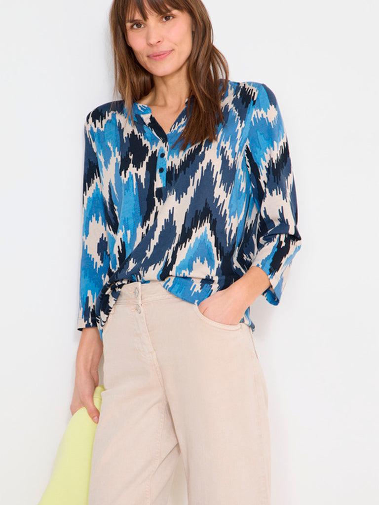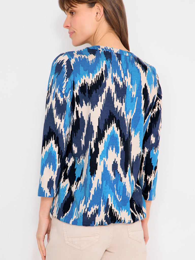 Camiseta versátil que combina comodidad y estilo. Diseño con manga 3/4 y escote en pico realzado por una tapeta decorativa con botones. El estampado aporta personalidad a tu look, mientras que el dobladillo elástico garantiza un ajuste perfecto y movimiento natural.