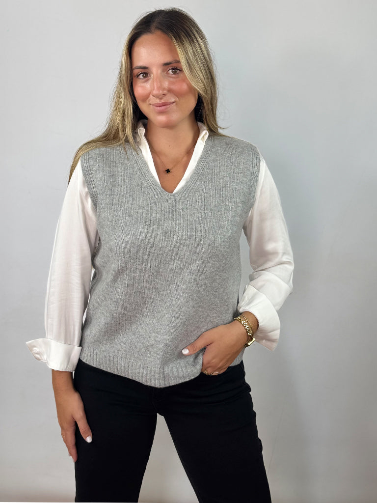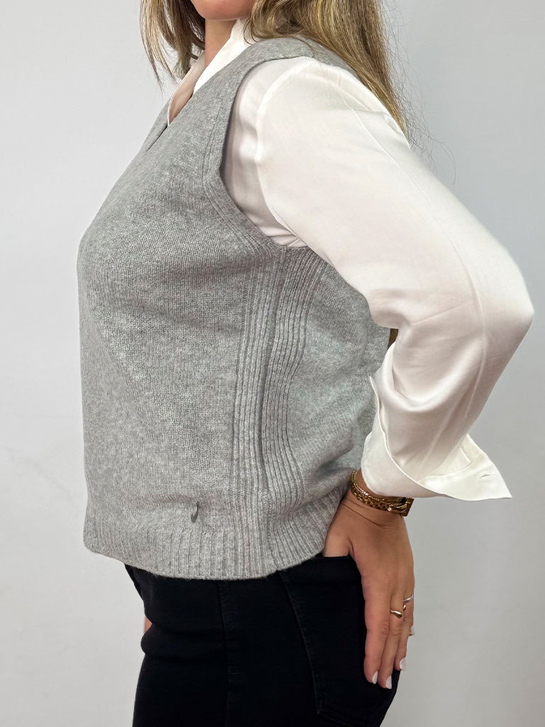 Chaleco cerrado con un favorecedor escote en pico que estiliza la silueta, mientras que sus laterales con franja acanalada aportan un detalle moderno y sofisticado. Perfecto para complementar cualquier look con un toque de elegancia cómoda y versátil.