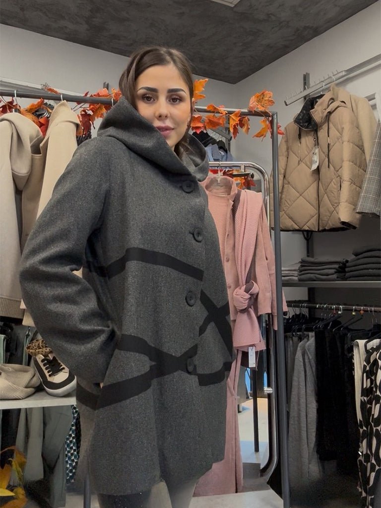 Chaquetón de paño ultraligero, combina comodidad y elegancia. Su distintiva capucha-cuello y detalles en líneas negras le confieren un toque moderno y sofisticado. Bolsillos laterales y forro interior.