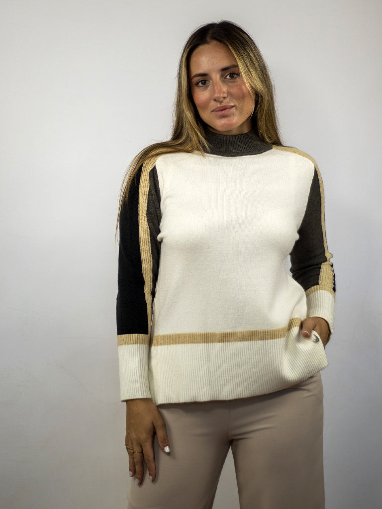 Jersey de cuello semi y mangas tricolor combina comodidad y estilo único. Los cortes laterales aportan libertad de movimiento y un ajuste favorecedor, ideal para cualquier ocasión donde quieras destacar con un toque moderno sin renunciar al confort.