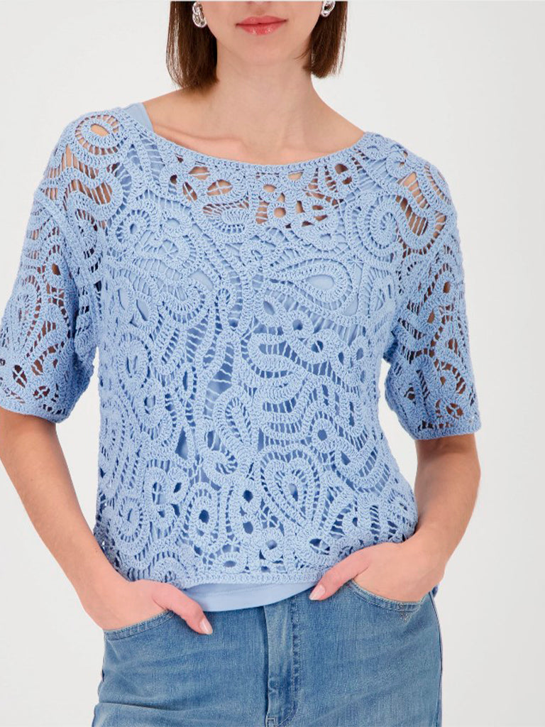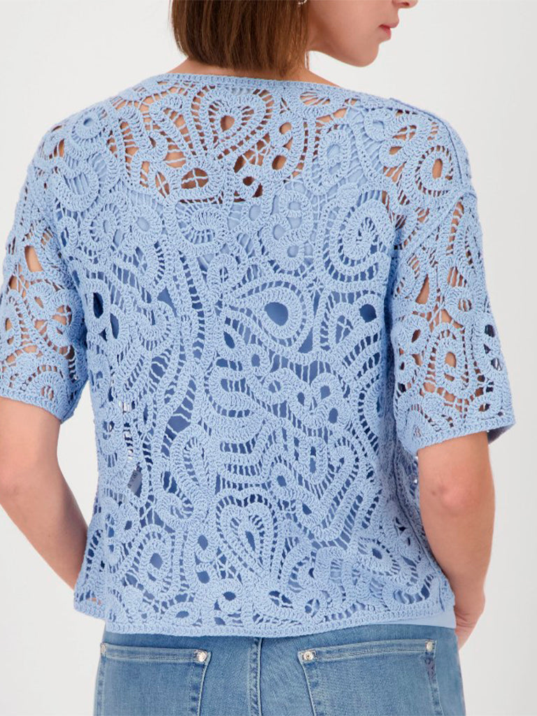 Jersey de crochet con manga a codo y escote barco. Diseño calado, ligero y fresco, ideal para llevar con una camiseta básica debajo. Aporta textura y un punto artesanal a cualquier look.