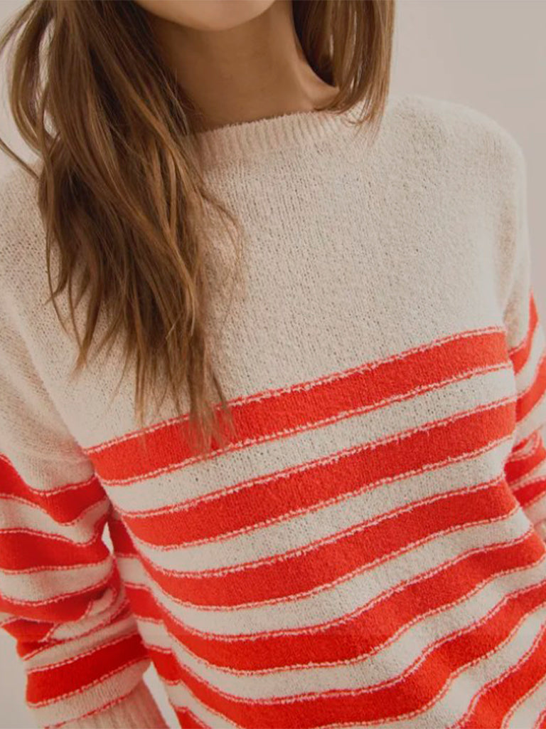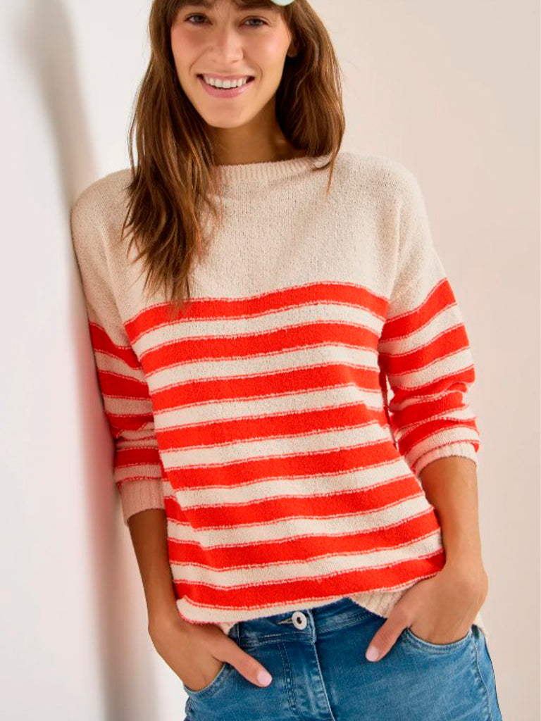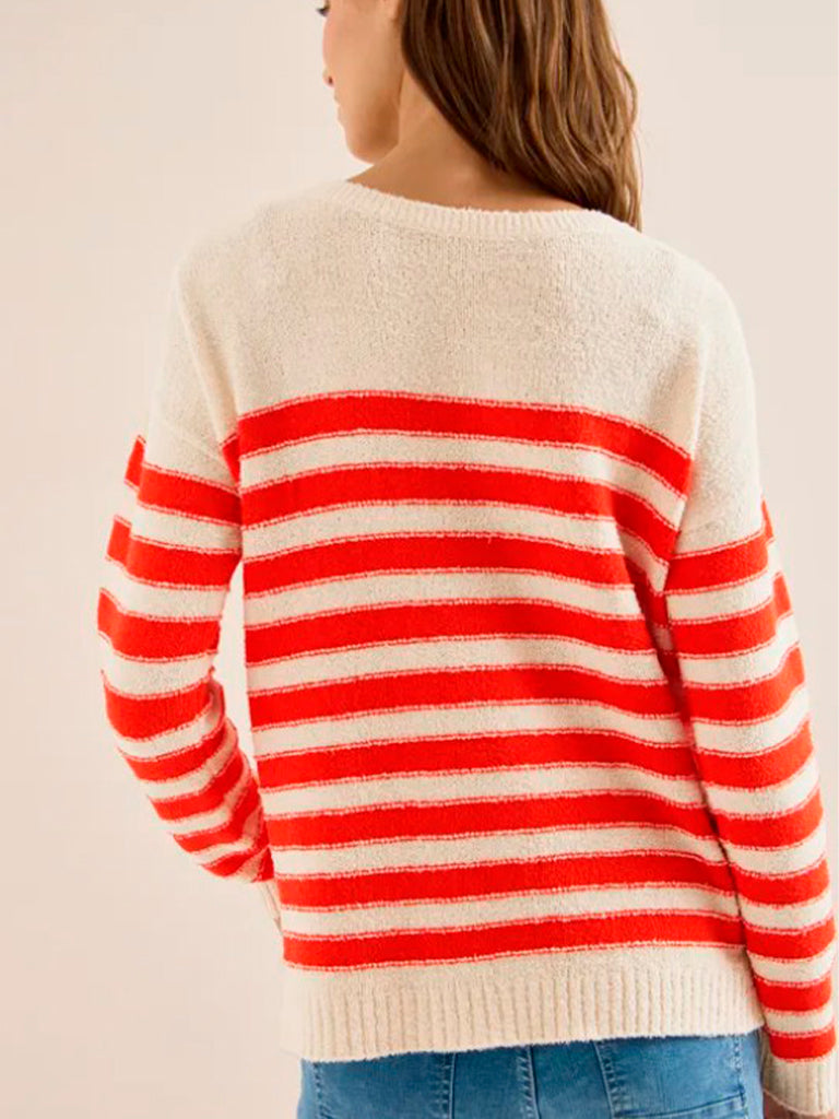 Jersey de rayas con aire marinero, tejido tipo bouclé suave y agradable. Diseño cómodo, cuello barco y manga larga, perfecto para dar un toque fresco y casual a cualquier look. Una prenda versátil, ligera y con ese punto especial que la hace diferente.