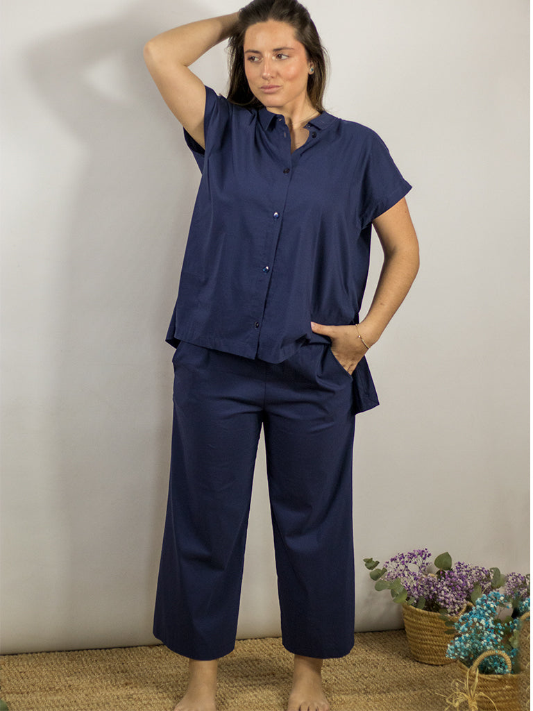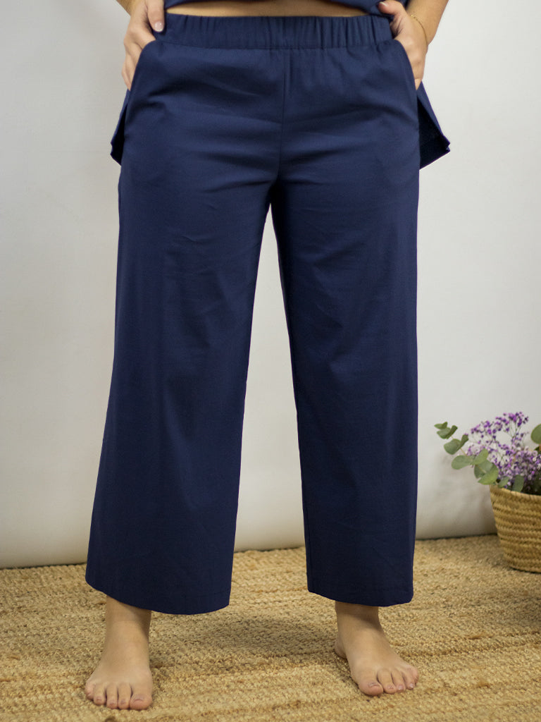 Pantalón con goma en la cintura y bolsillos laterales. Tipo culotte con costura cruzada trasera.