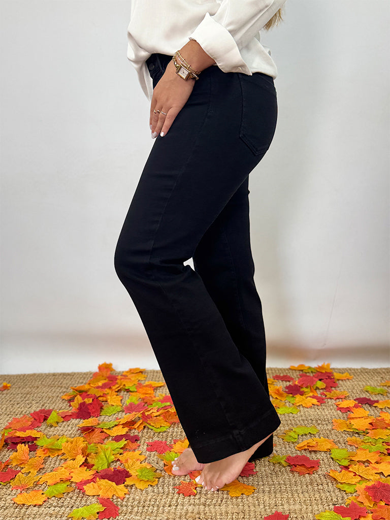 Tejano negro con corte boot cut que realza tu figura. Su tiro alto ofrece un ajuste perfecto, ideal para looks modernos y elegantes.
